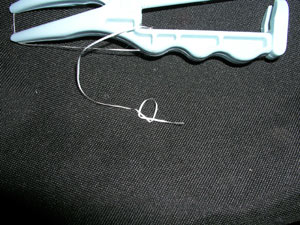 Tie a knot in the end of the new floss. Position this knot in the "V"